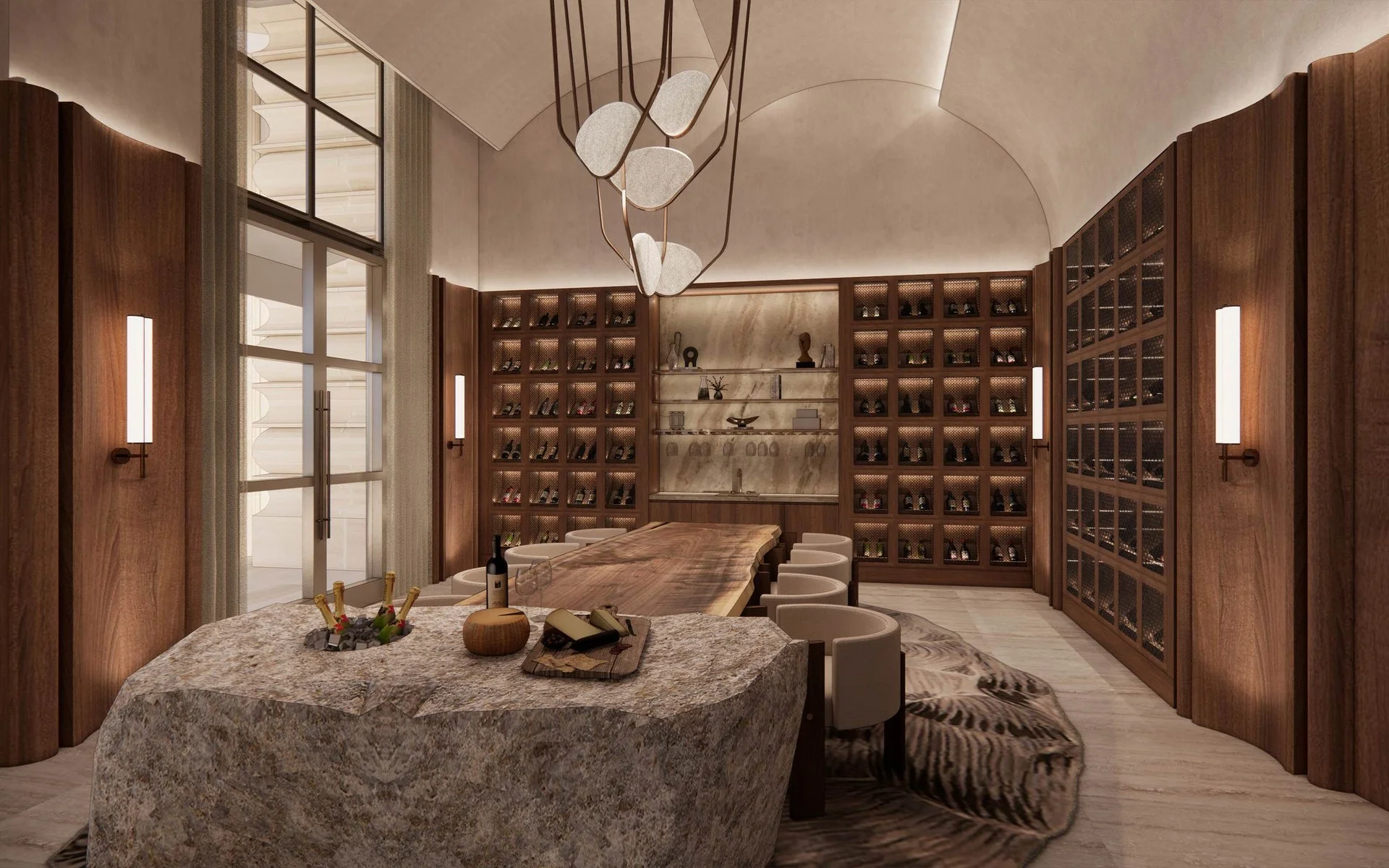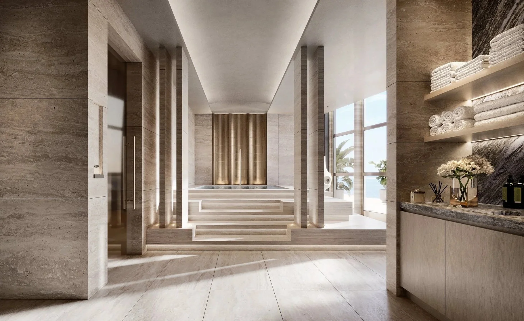From the grand, sculptural entry to the subterranean serenity of the wellness suites, the design utilizes a consistent palette of travertine, warm woods, and deep oceanic jades to create a seamless transition between vibrant social hubs and private retreats.