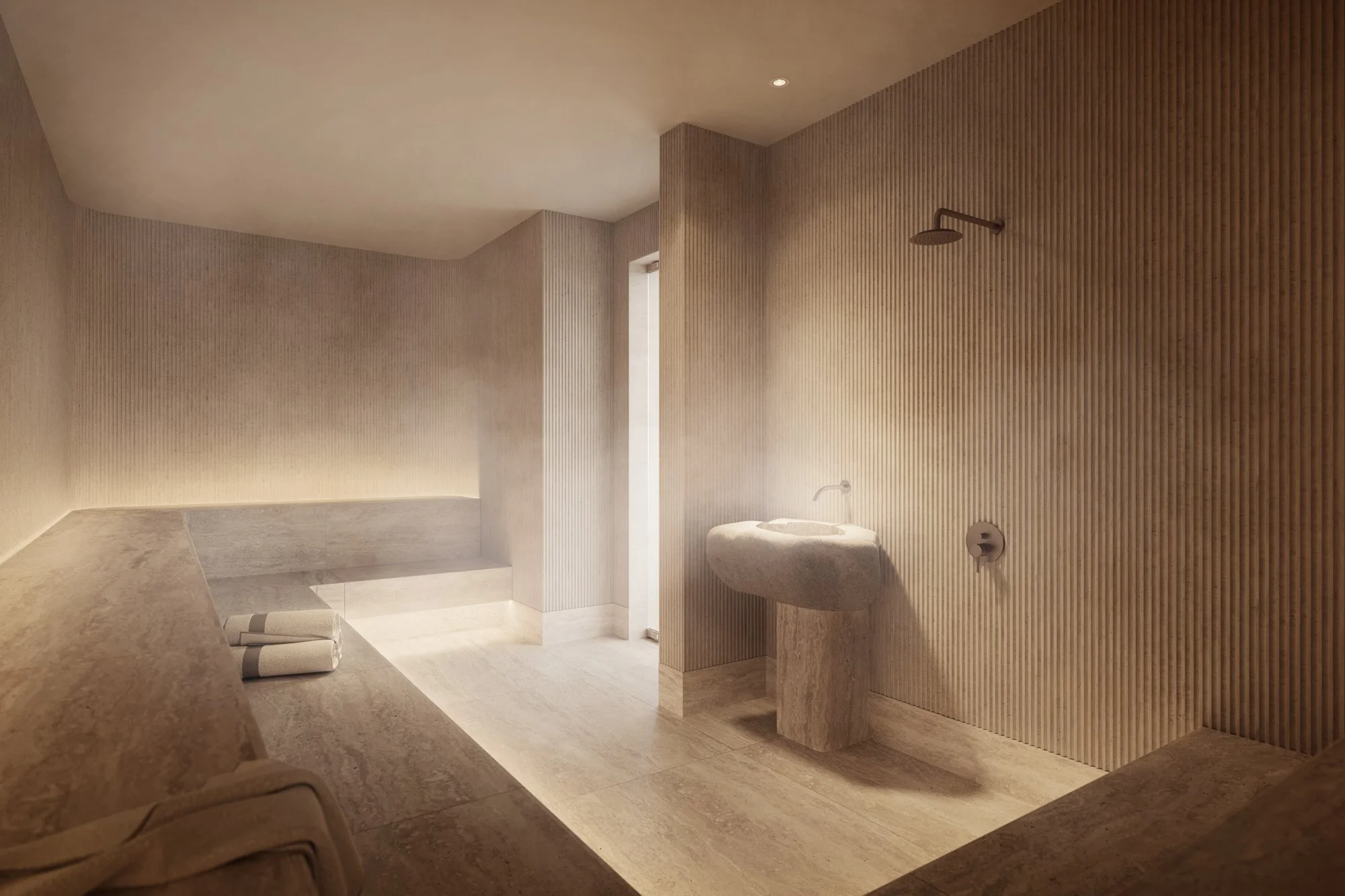 The experience is completed by a precision-crafted cedar sauna with integrated cove lighting and a fluted stone steam room featuring a carved stone pedestal sink.