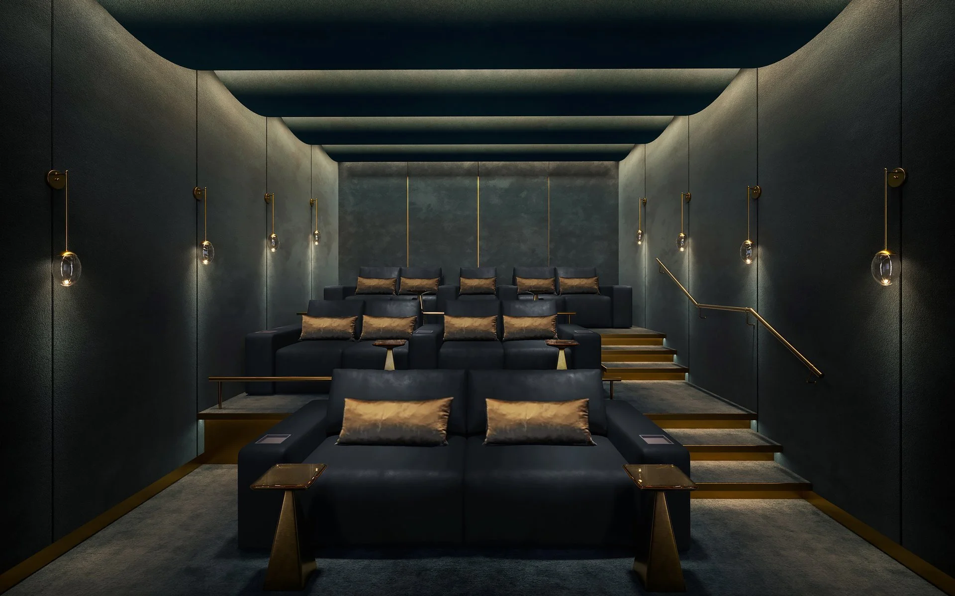 The screening room is an exercise in high-drama acoustics and comfort. Deep teal, suede-wrapped walls are accented by vertical brass inlays and orb-like glass sconces, creating a cinematic cocoon.