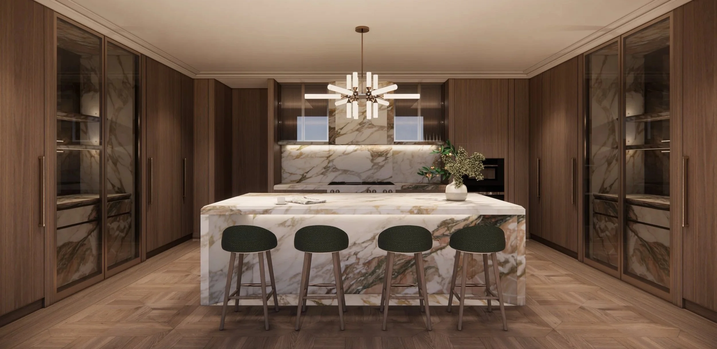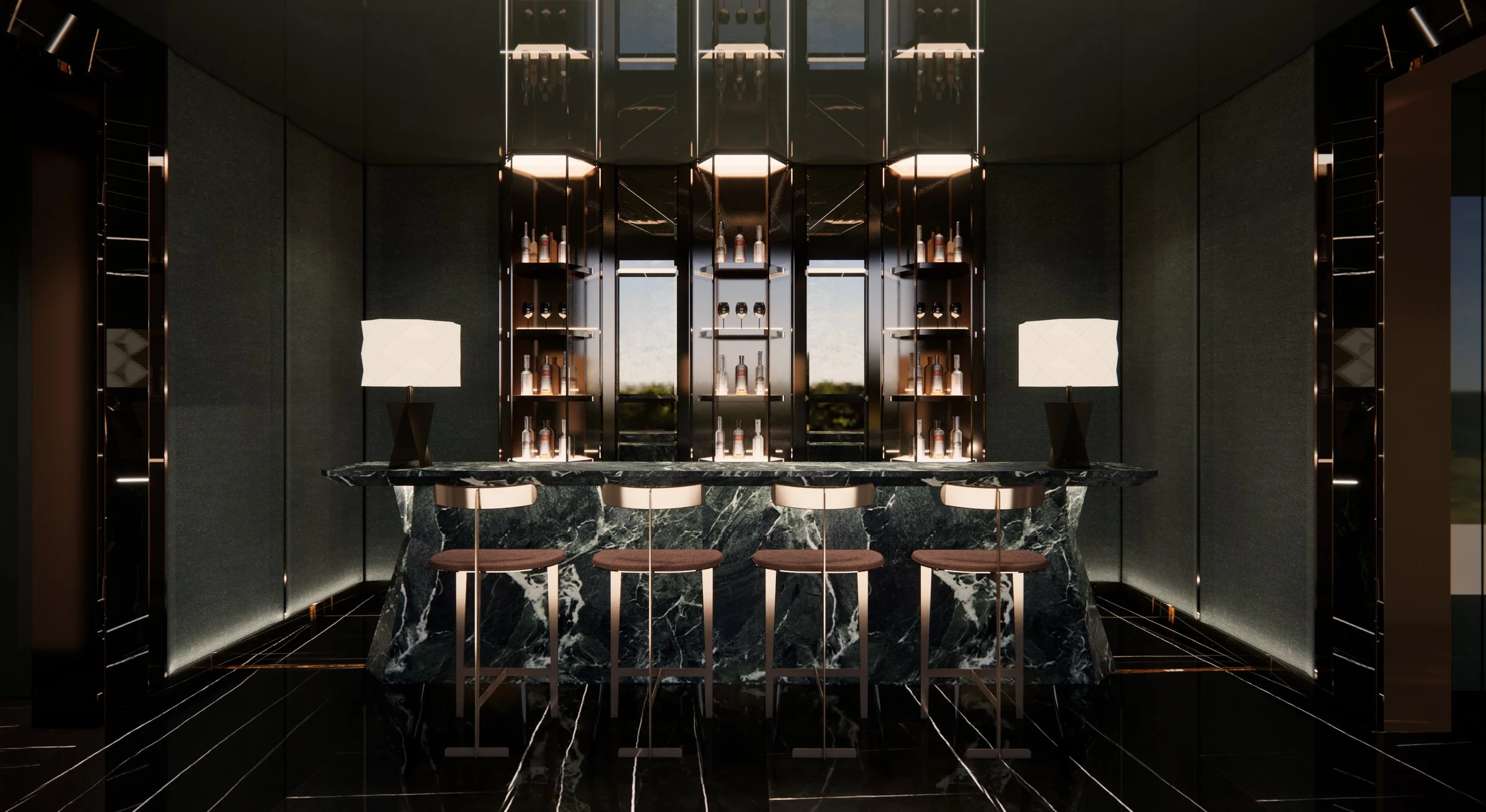 For evening entertaining, the private bar is an intimate, jewel-box space. A monolithic green marble bar top rests on a fluted stone base, set against backlit crystal shelving. The mirrored ceiling and dark fabric wall panels ensure the atmosphere remains moody, focused entirely on the craft of the cocktail and the glimmer of the city lights.
