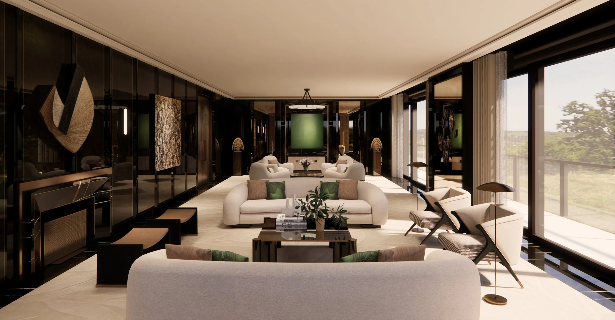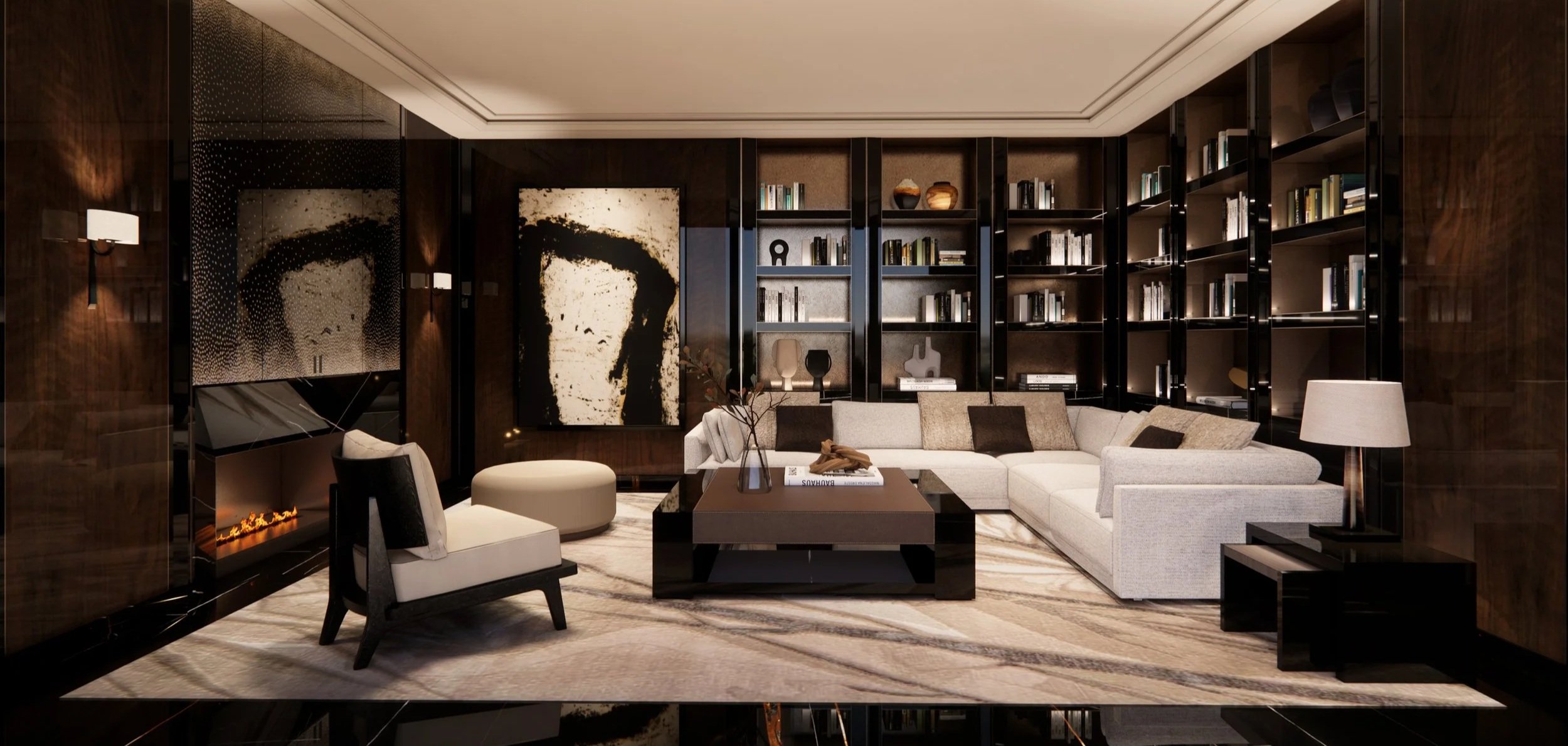 Designed for high-drama hosting, the dining room features a monumental dark stone table that comfortably seats twelve. Above, a cascading crystal-shards chandelier provides a fractured, ethereal light, while the backdrop, a large-scale abstract triptych, adds a layer of gestural energy to the otherwise disciplined, rhythmic millwork.