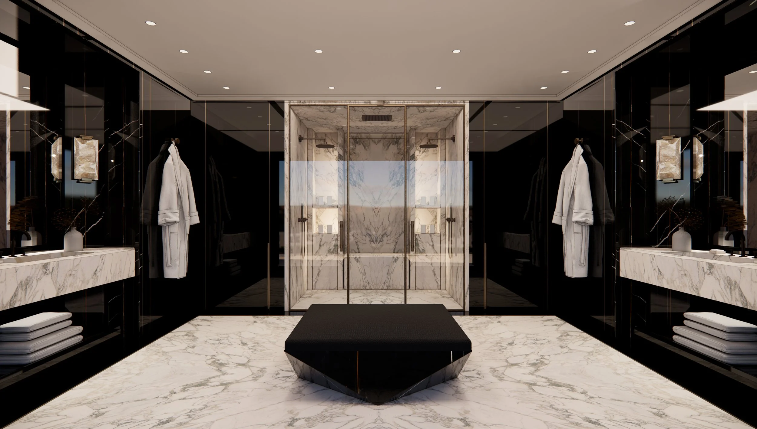 The "His" Suite: A bold, high-contrast sanctuary. Mirrored black cabinetry and dark stone walls frame a central, book-matched marble shower, creating a sharp, masculine aesthetic that feels both private and powerful.