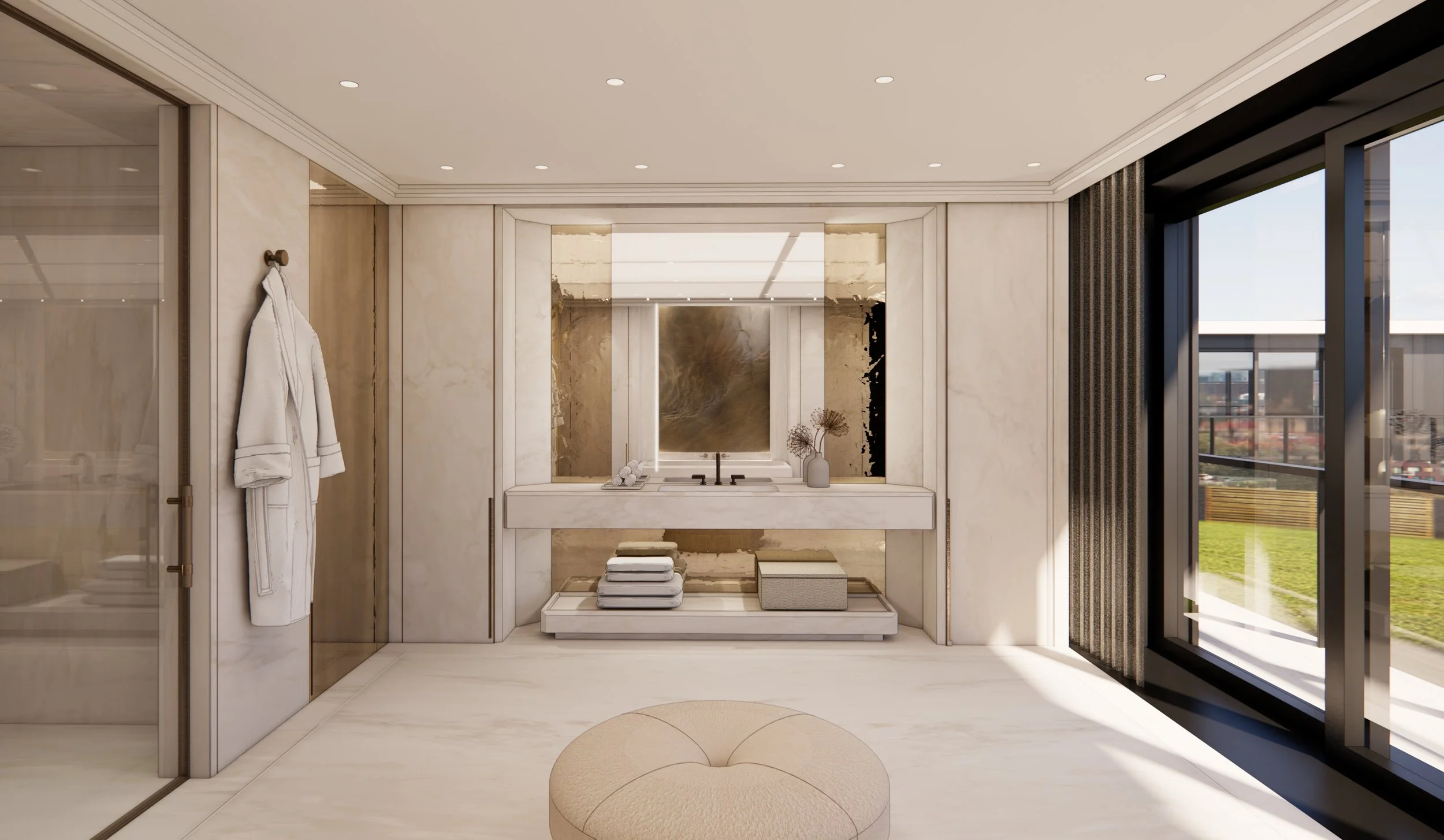 The "Hers" Suite: A luminous, ethereal grotto sculpted from white Statuario marble. A monolithic vanity floats against a mirrored wall, flooded with natural light from the wrap-around terrace.